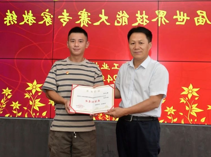 控股集团班子成员向侯世峰美术老师发证市国资委宣讲竞技“最优设计创意奖”